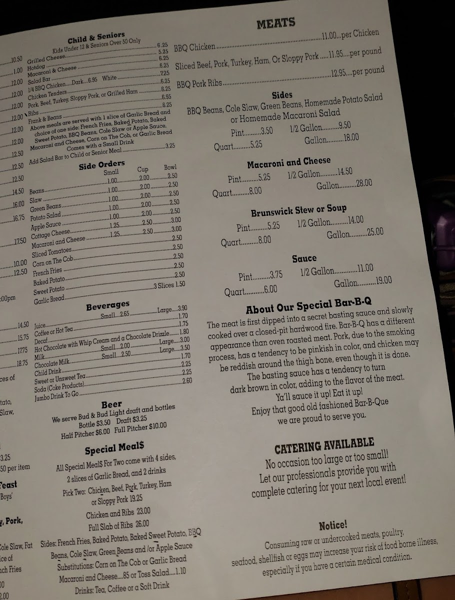 “ I look for great food places, and I found this one. Really friendly wait staff. Fast service. Very, very good foods. I got the deluxe combo dinner with three sides. 3 ribs, 2 pieces of tasty BBQ chicken , beef and pork slices all smoked and not shredded. Tea, two slices of toast. All this Ina major tourist area for under 20.00. It was also not crowded on a Saturday night. I highly recommend. ”